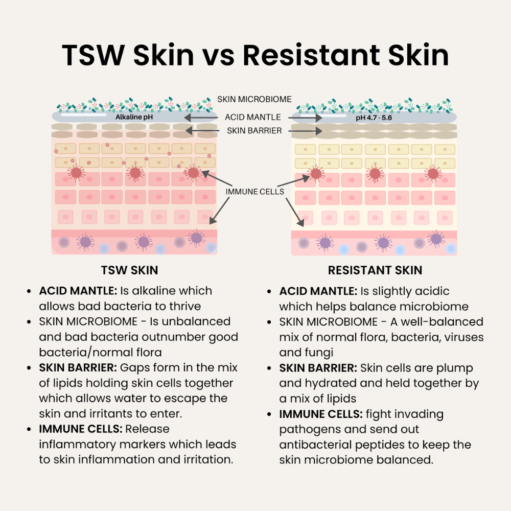 It's formulated to complement your body’s natural healing rhythm - free from steroids, fragrance and harsh actives. TSW safe skincare that listens to your skin, not one that forces it into submission.